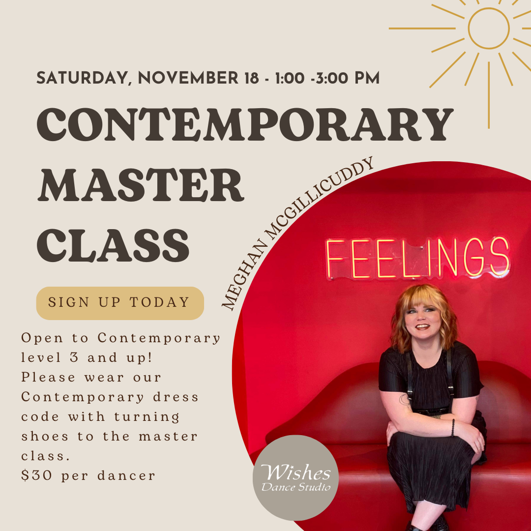 Contemporary Master Class Saturday, November 18, 2023 1:00 PM 3:00 PM Wishes Dance Studio 12810 Ford Drive Fishers, IN, 46038 United States (map) Google Calendar ICS Register